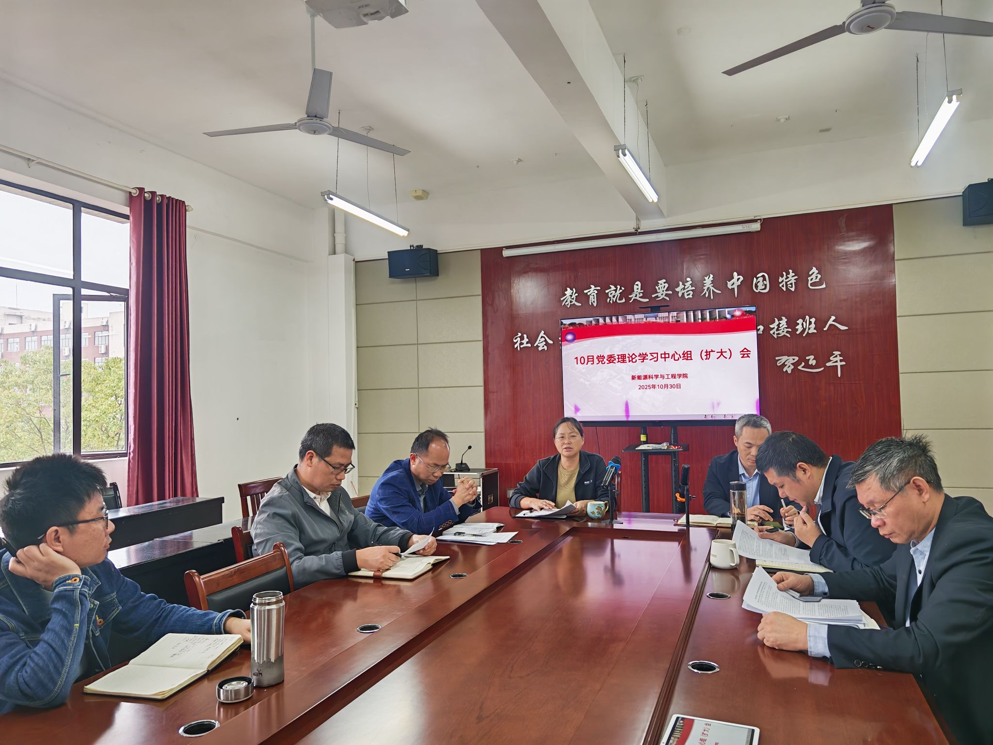 10月30日,新能源科学与工程学院召开党委理论学习中心组(扩大会)集体学习会,传达学习党的二十届四中全会精神。学院领导班子成员、各科室负责人参加学习,学院党委书记陈莲香主持会议并领学。